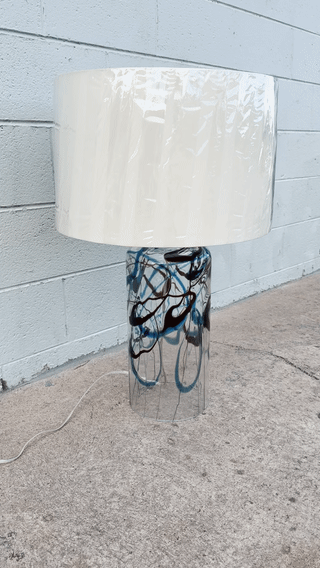 New overstock Arteriors Whistler table lamp with a handblown glass base featuring brown and blue swirls and an off white drum shade. Still has the protective wrap on the shade and has never been used. Original retail over $500. Beautiful modern statement lamp that adds artful character and soft light to any space. 30" high Lamp
