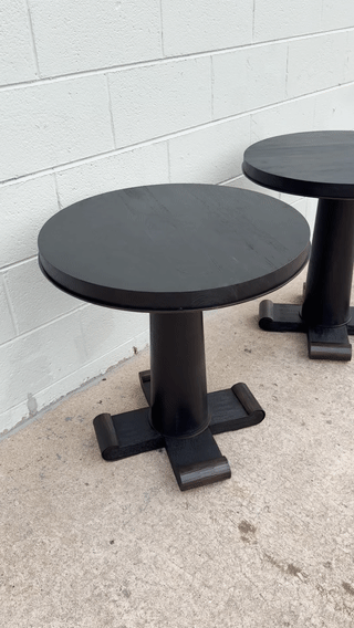 Modern Hurst End Tables from Arteriors, featuring a sculptural pedestal base and rich black wood finish. Clean, contemporary lines with subtle texture detailing at the base. Both tables are new returns in excellent condition with no visible wear. Sold individually or as a pair.