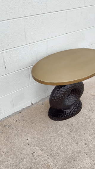 Designer end table by Arteriors. The Seth features a sculptural hand-hammered iron base with an open circle design and an antique brass top. Distinctive, high-quality construction that adds a touch of modern artistry to any space. There’s a slight mark on the top and a small gap along the top seam—both cosmetic and reflected in the price. Structurally solid and visually striking. Retails for $1,560 new! Side table, accent table, bedside table, nightstand, End Tables