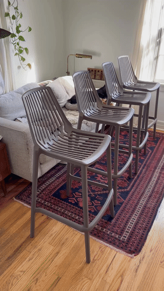 Dimensions are appx. 18"D x 17.7"W x 40.2"H. Seat height is 30”. These modern bar stools are amazing - comfortable, easy to clean, stackable. They were kept inside for the short time we had them (decided to re lay out the area they’re in and are taking out the bar, hence getting rid of them). They can certainly be used as outdoor seating as well. Originally $266 per stool, I’m selling $400 for all four.